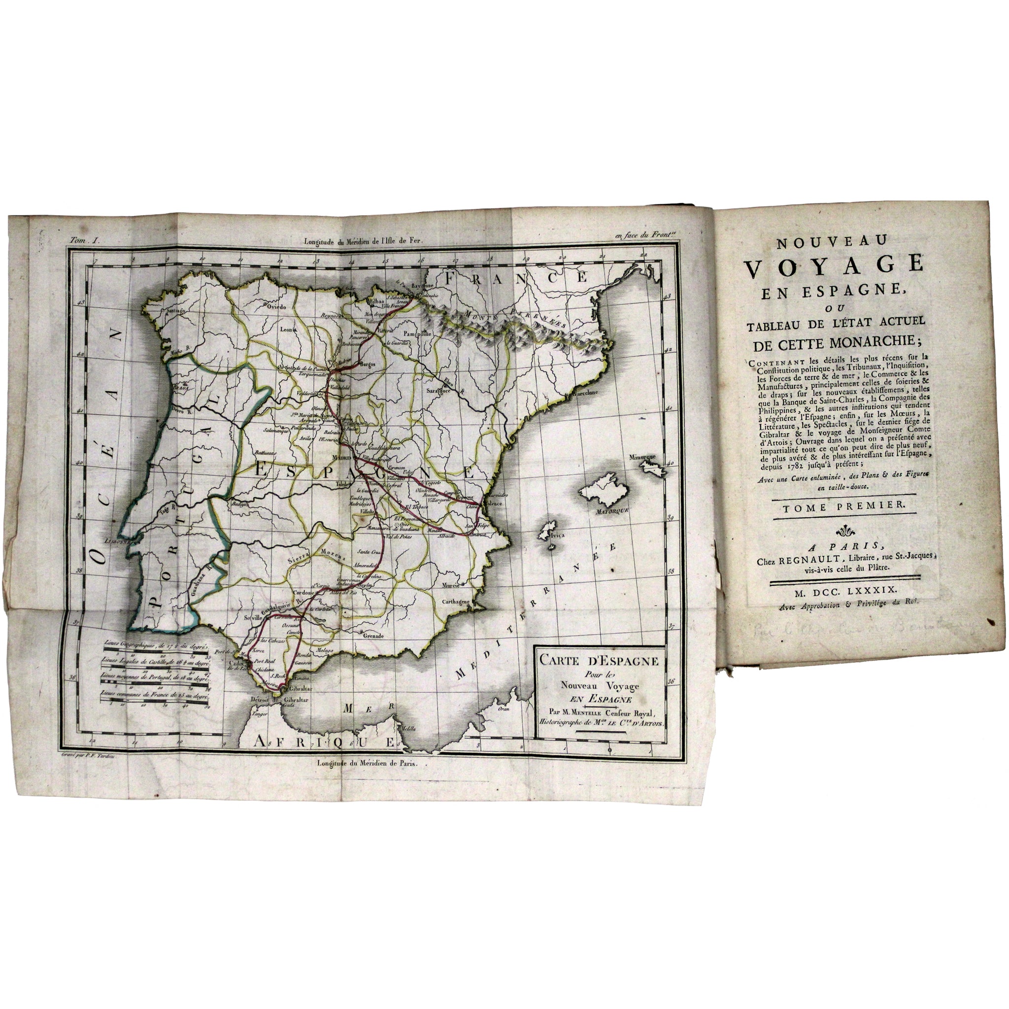 3 vols. 8vo. pp. [iv], iv,368, [ii]; [iv], 382; [iv], 402, [ii] + 3 engraved folding maps (Spain, Madrid and Cadiz, engraved by Pierre François Tardieu) and 9 folding plates. Occasional wormholes in lower margin, one or two small spots and stains, contemporary calf, some wear to joints, headcaps and extremities. Author’s name, ‘Bourgoing’, given in a contemporary hand on front pastedown.
