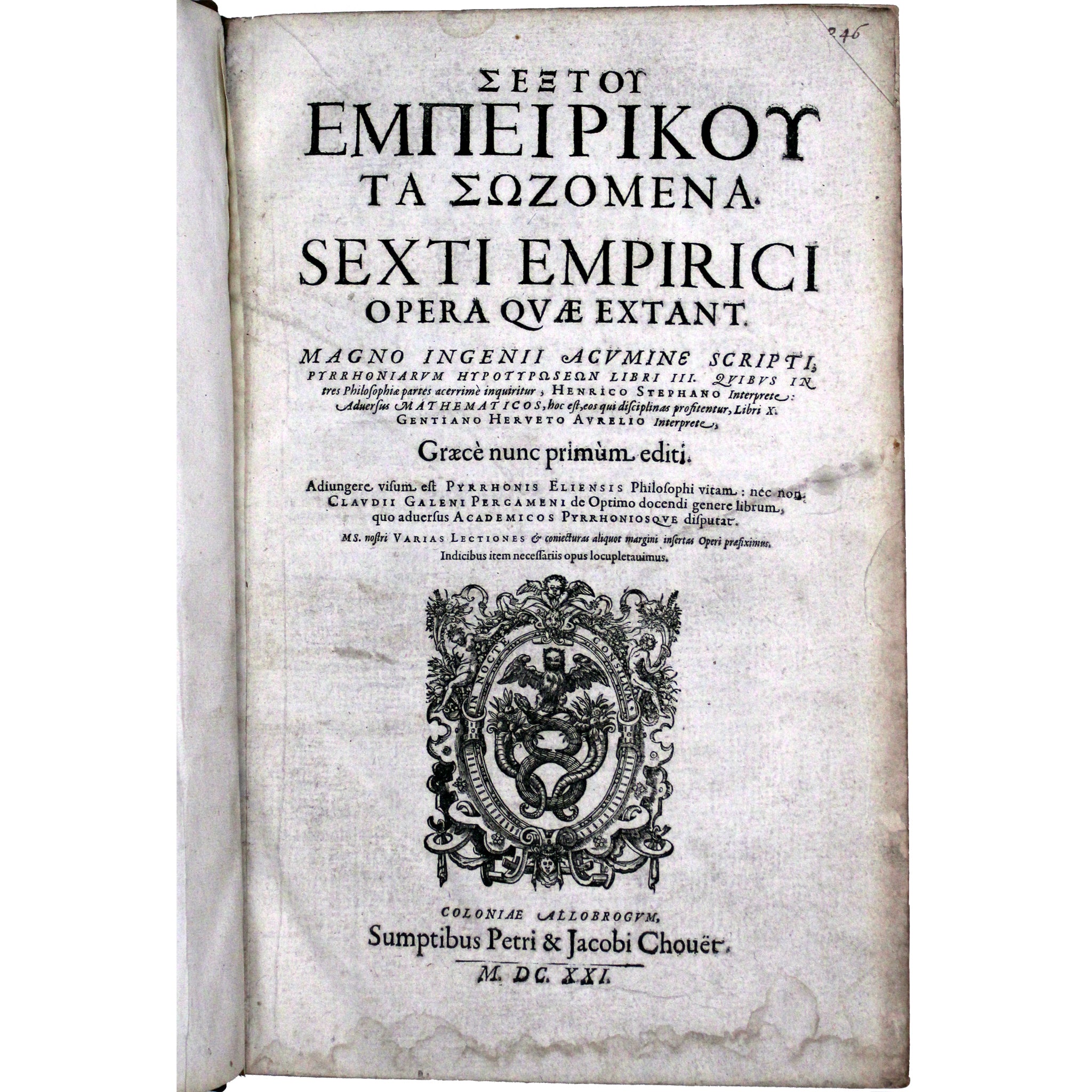 Sextus was read widely over the following 300 years, and his works had a profound influence on the thinking of Montaigne, Descartes, Hume, Hegel and other pivotal figures in early modern and enlightenment philosophy. Our 1621 editio princeps was printed by Pierre and Jacques Chouët with variant title-pages with Paris and Cologne or Geneva imprints, a convention which seems to have smoothed the import and export of books between Protestant Switzerland and Catholic France.