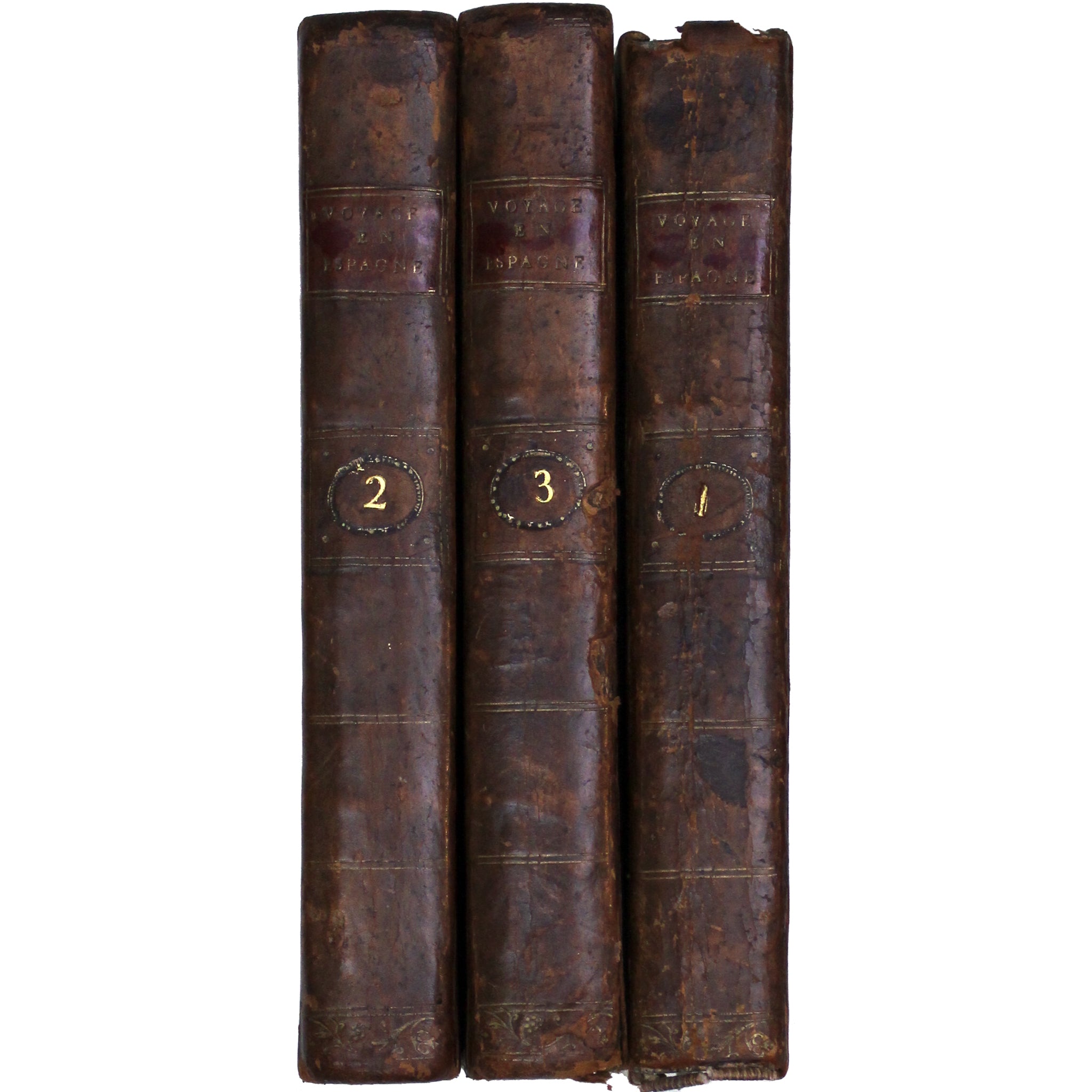 3 vols. 8vo. pp. [iv], iv,368, [ii]; [iv], 382; [iv], 402, [ii] + 3 engraved folding maps (Spain, Madrid and Cadiz, engraved by Pierre François Tardieu) and 9 folding plates. Occasional wormholes in lower margin, one or two small spots and stains, contemporary calf, some wear to joints, headcaps and extremities. Author’s name, ‘Bourgoing’, given in a contemporary hand on front pastedown.